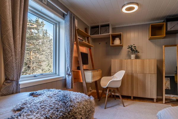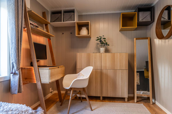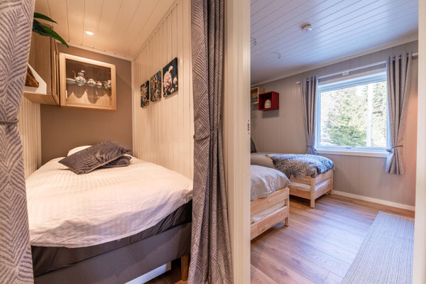Additional bed space hidden behind a blackout curtain, which can be used for extra guests, or as a relaxing corner for reading books or just hanging out. The space offers a comfortable bed, bookshelve and cabinets, including power supply for phone / laptop charging.