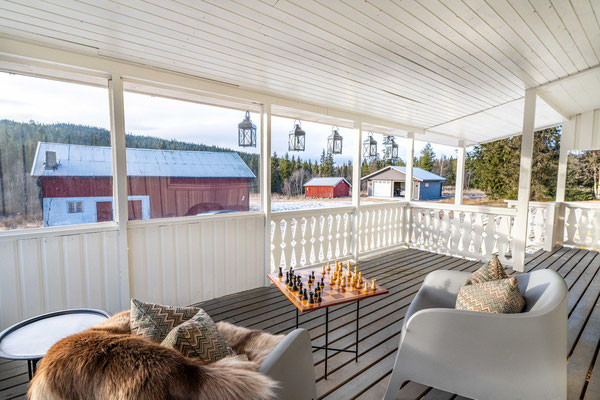 The covered terrace and external stairs offer access to the main entrance door. The large illuminated terrace is perfect for enjoying outdoor dinners and relaxing with the most beautiful view over the land and terrain. The terrace was fully re-painted in 2020.